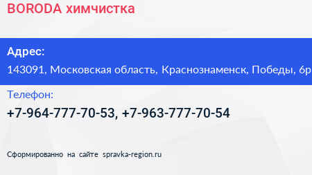 BORODA, химчистка по адресу 143091, Московская область, Краснознаменск, Победы, 6р в дальнейшем Организация, размещена в следующих категориях: