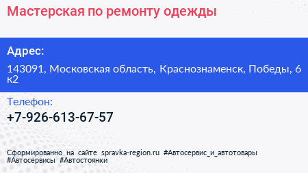 Мастерская по ремонту одежды по адресу 143091, Московская область, Краснознаменск, Победы, 6 к2 в дальнейшем Организация, размещена в следующих категориях:
