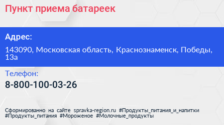 Пункт приема батареек по адресу 143090, Московская область, Краснознаменск, Победы, 13а в дальнейшем Организация, размещена в следующих категориях: