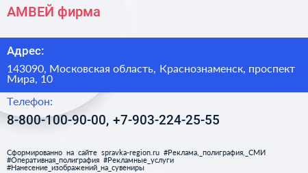 АМВЕЙ, фирма по адресу 143090, Московская область, Краснознаменск, проспект Мира, 10 в дальнейшем Организация, размещена в следующих категориях: