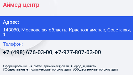 Аймед, центр по адресу 143090, Московская область, Краснознаменск, Советская, 1 в дальнейшем Организация, размещена в следующих категориях: