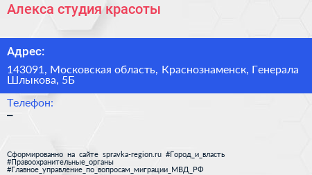 Алекса, студия красоты по адресу 143091, Московская область, Краснознаменск, Генерала Шлыкова, 5Б в дальнейшем Организация, размещена в следующих категориях: