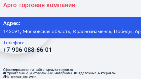 Арго, торговая компания по адресу 143091, Московская область, Краснознаменск, Победы, 6р в дальнейшем Организация, размещена в следующих категориях: