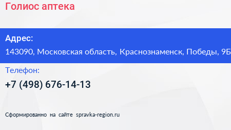 Голиос, аптека по адресу 143090, Московская область, Краснознаменск, Победы, 9Б в дальнейшем Организация, размещена в следующих категориях:
