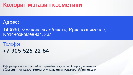 Колорит, магазин косметики по адресу 143090, Московская область, Краснознаменск, Краснознаменная, 23а в дальнейшем Организация, размещена в следующих категориях: