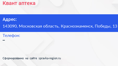 Квант, аптека по адресу 143090, Московская область, Краснознаменск, Победы, 13 в дальнейшем Организация, размещена в следующих категориях: