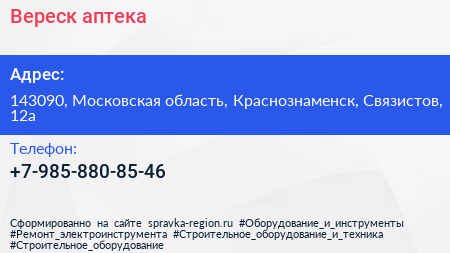 Вереск, аптека по адресу 143090, Московская область, Краснознаменск, Связистов, 12а в дальнейшем Организация, размещена в следующих категориях:
