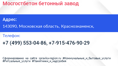 Мосгостбетон, бетонный завод по адресу 143090, Московская область, Краснознаменск, в дальнейшем Организация, размещена в следующих категориях: