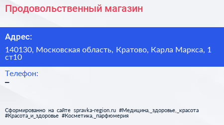 Продовольственный магазин по адресу 140130, Московская область, Кратово, Карла Маркса, 1 ст10 в дальнейшем Организация, размещена в следующих категориях:
