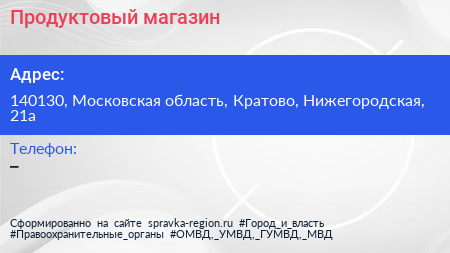 Продуктовый магазин по адресу 140130, Московская область, Кратово, Нижегородская, 21а в дальнейшем Организация, размещена в следующих категориях: