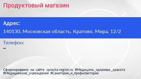 Продуктовый магазин по адресу 140130, Московская область, Кратово, Мира, 12/2 в дальнейшем Организация, размещена в следующих категориях: