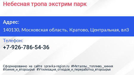 Небесная тропа, экстрим-парк по адресу 140130, Московская область, Кратово, Центральная, вл3 в дальнейшем Организация, размещена в следующих категориях: