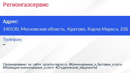 Регионгазсервис по адресу 140130, Московская область, Кратово, Карла Маркса, 21Б в дальнейшем Организация, размещена в следующих категориях: