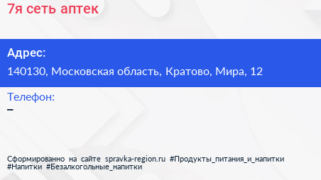 7я, сеть аптек по адресу 140130, Московская область, Кратово, Мира, 12 в дальнейшем Организация, размещена в следующих категориях: