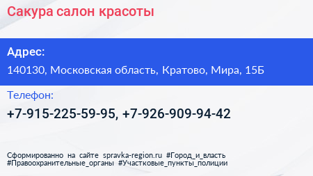 Сакура, салон красоты по адресу 140130, Московская область, Кратово, Мира, 15Б в дальнейшем Организация, размещена в следующих категориях: