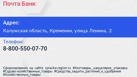 Почта Банк по адресу Калужская область, Кременки, улица Ленина, 2 в дальнейшем Организация, размещена в следующих категориях: