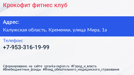 Крокофит, фитнес-клуб по адресу Калужская область, Кременки, улица Мира, 1а в дальнейшем Организация, размещена в следующих категориях: