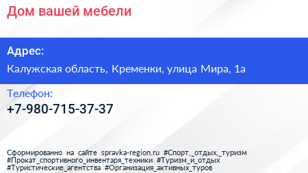 Дом вашей мебели по адресу Калужская область, Кременки, улица Мира, 1а в дальнейшем Организация, размещена в следующих категориях: