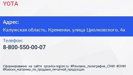 YOTA по адресу Калужская область, Кременки, улица Циолковского, 4а в дальнейшем Организация, размещена в следующих категориях:
