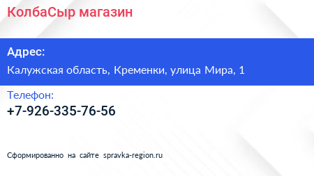 КолбаСыр, магазин по адресу Калужская область, Кременки, улица Мира, 1 в дальнейшем Организация, размещена в следующих категориях: