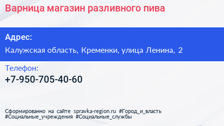 Варница, магазин разливного пива по адресу Калужская область, Кременки, улица Ленина, 2 в дальнейшем Организация, размещена в следующих категориях: