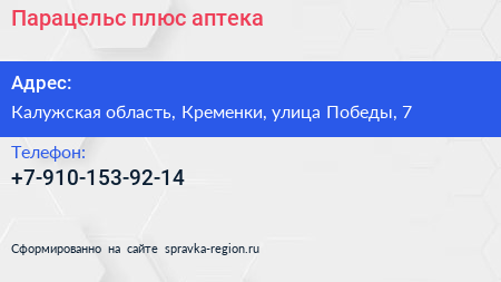Парацельс плюс, аптека по адресу Калужская область, Кременки, улица Победы, 7 в дальнейшем Организация, размещена в следующих категориях: