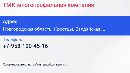 ТМК, многопрофильная компания по адресу Новгородская область, Крестцы, Валдайская, 1 в дальнейшем Организация, размещена в следующих категориях: