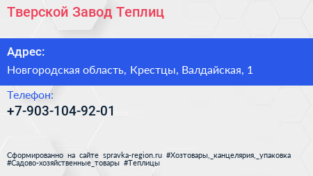 Тверской Завод Теплиц по адресу Новгородская область, Крестцы, Валдайская, 1 в дальнейшем Организация, размещена в следующих категориях: