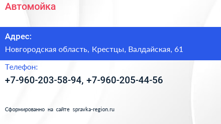 Автомойка по адресу Новгородская область, Крестцы, Валдайская, 61 в дальнейшем Организация, размещена в следующих категориях: