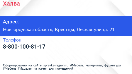 Халва по адресу Новгородская область, Крестцы, Лесная улица, 21 в дальнейшем Организация, размещена в следующих категориях: