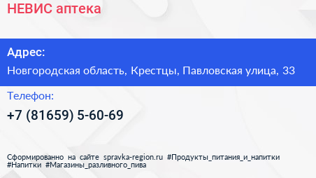 НЕВИС, аптека по адресу Новгородская область, Крестцы, Павловская улица, 33 в дальнейшем Организация, размещена в следующих категориях: