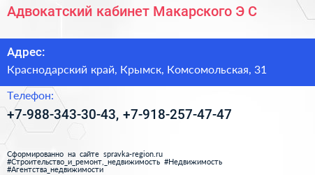 Адвокатский кабинет Макарского Э.С. по адресу Краснодарский край, Крымск, Комсомольская, 31 в дальнейшем Организация, размещена в следующих категориях: