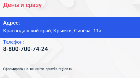 Деньги сразу по адресу Краснодарский край, Крымск, Синёва, 11а в дальнейшем Организация, размещена в следующих категориях: