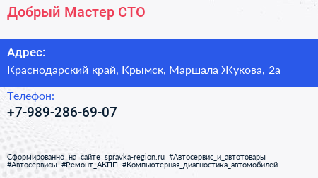 Добрый Мастер, СТО по адресу Краснодарский край, Крымск, Маршала Жукова, 2а в дальнейшем Организация, размещена в следующих категориях: