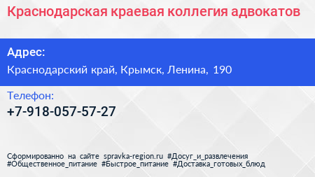 Краснодарская краевая коллегия адвокатов по адресу Краснодарский край, Крымск, Ленина, 190 в дальнейшем Организация, размещена в следующих категориях: