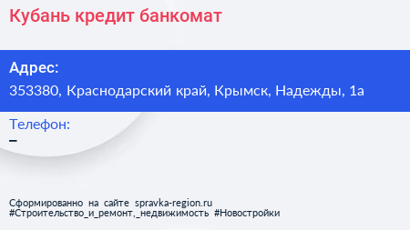Кубань кредит, банкомат по адресу 353380, Краснодарский край, Крымск, Надежды, 1а в дальнейшем Организация, размещена в следующих категориях: