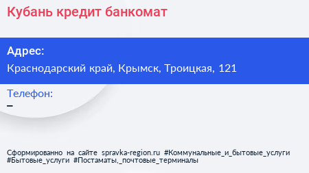 Кубань кредит, банкомат по адресу Краснодарский край, Крымск, Троицкая, 121 в дальнейшем Организация, размещена в следующих категориях: