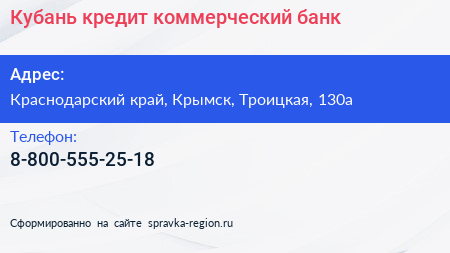 Кубань кредит, коммерческий банк по адресу Краснодарский край, Крымск, Троицкая, 130а в дальнейшем Организация, размещена в следующих категориях: