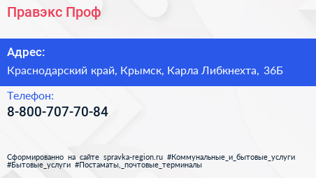 Правэкс Проф по адресу Краснодарский край, Крымск, Карла Либкнехта, 36Б в дальнейшем Организация, размещена в следующих категориях: