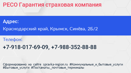 РЕСО-Гарантия, страховая компания по адресу Краснодарский край, Крымск, Синёва, 2Б/2 в дальнейшем Организация, размещена в следующих категориях: