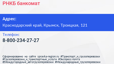 РНКБ, банкомат по адресу Краснодарский край, Крымск, Троицкая, 121 в дальнейшем Организация, размещена в следующих категориях: