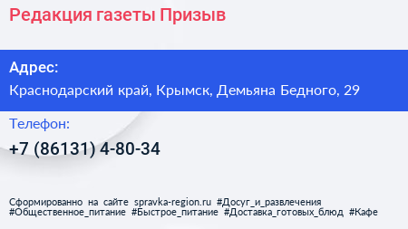 Редакция газеты Призыв по адресу Краснодарский край, Крымск, Демьяна Бедного, 29 в дальнейшем Организация, размещена в следующих категориях: