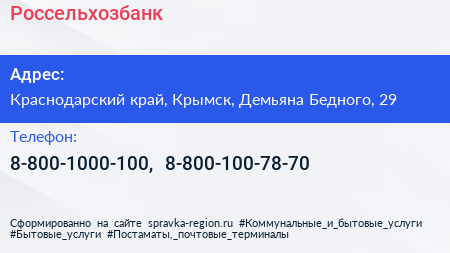 Россельхозбанк по адресу Краснодарский край, Крымск, Демьяна Бедного, 29 в дальнейшем Организация, размещена в следующих категориях: