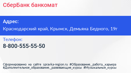 СберБанк, банкомат по адресу Краснодарский край, Крымск, Демьяна Бедного, 19г в дальнейшем Организация, размещена в следующих категориях: