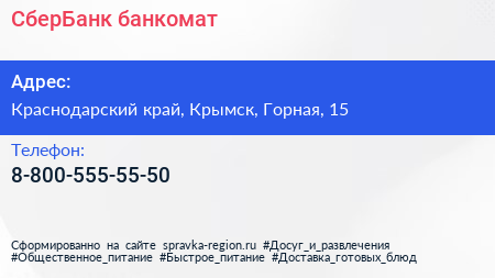 СберБанк, банкомат по адресу Краснодарский край, Крымск, Горная, 15 в дальнейшем Организация, размещена в следующих категориях:
