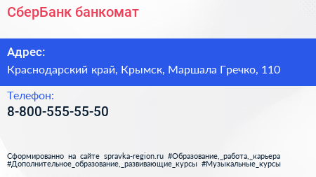 СберБанк, банкомат по адресу Краснодарский край, Крымск, Маршала Гречко, 110 в дальнейшем Организация, размещена в следующих категориях:
