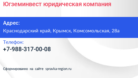 Югземинвест, юридическая компания по адресу Краснодарский край, Крымск, Комсомольская, 28а в дальнейшем Организация, размещена в следующих категориях: