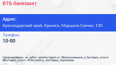 ВТБ, банкомат по адресу Краснодарский край, Крымск, Маршала Гречко, 130 в дальнейшем Организация, размещена в следующих категориях: