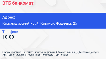 ВТБ, банкомат по адресу Краснодарский край, Крымск, Фадеева, 25 в дальнейшем Организация, размещена в следующих категориях: