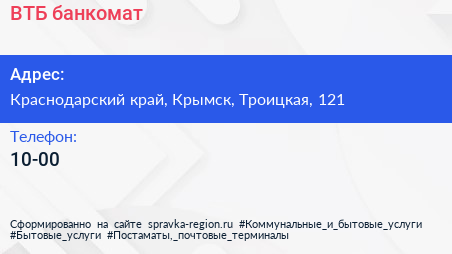 ВТБ, банкомат по адресу Краснодарский край, Крымск, Троицкая, 121 в дальнейшем Организация, размещена в следующих категориях: